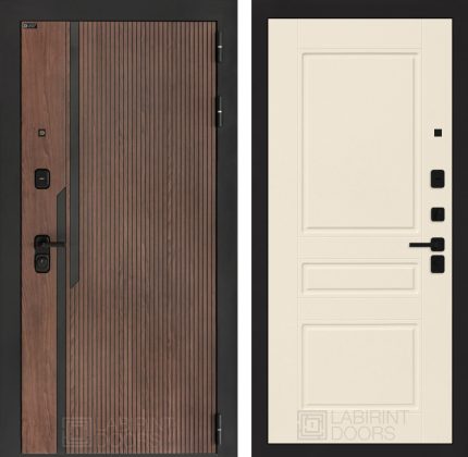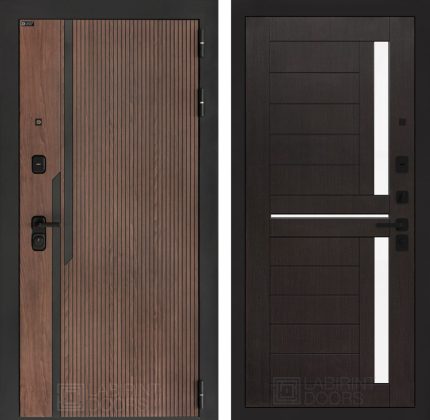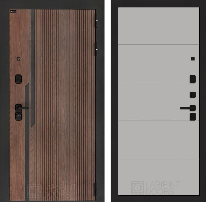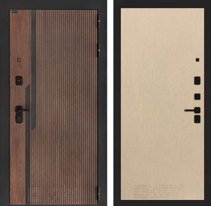 Отделка снаружи=’Фрезерованная МДФ панель 10 мм, цвет «Орех американский» с патиной и вставками из металла в цвет наличника’