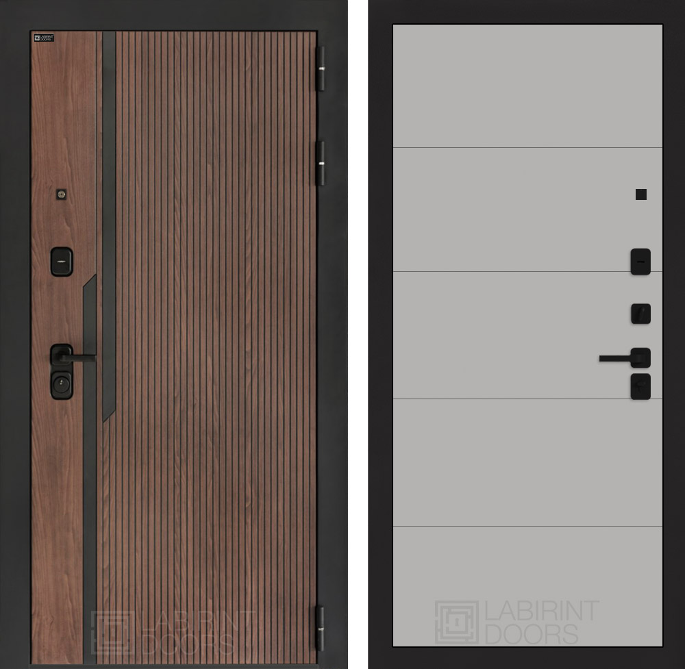 Отделка снаружи: Фрезерованная МДФ панель 10 мм, цвет «Орех американский» с патиной и вставками из металла в цвет наличника