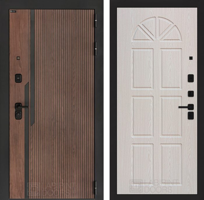 Отделка снаружи=’Фрезерованная МДФ панель 10 мм, цвет «Орех американский» с патиной и вставками из металла в цвет наличника’
