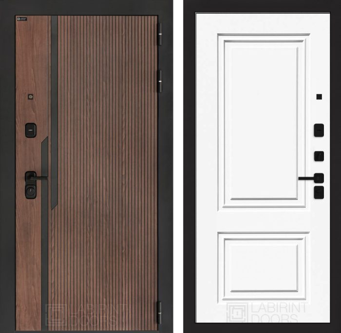 Отделка снаружи=’Фрезерованная МДФ панель 10 мм, цвет «Орех американский» с патиной и вставками из металла в цвет наличника’