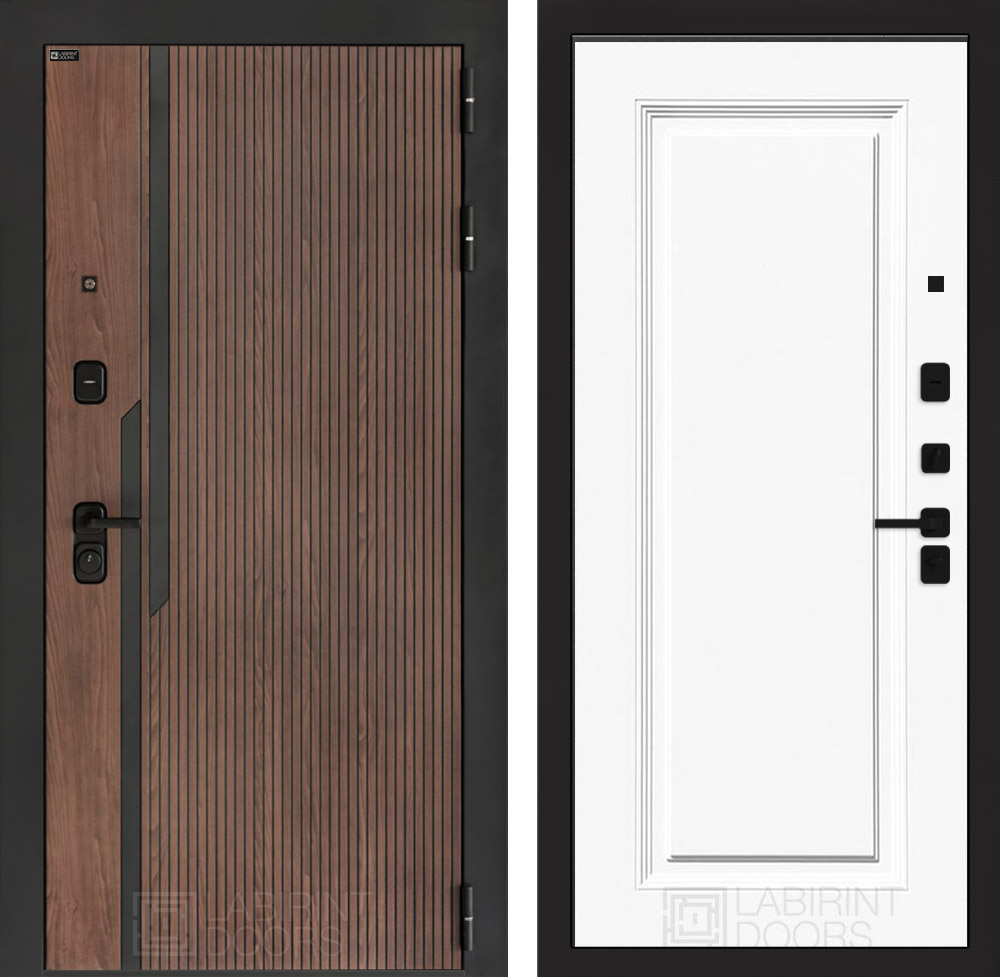 Отделка снаружи=’Фрезерованная МДФ панель 10 мм, цвет «Орех американский» с патиной и вставками из металла в цвет наличника’