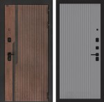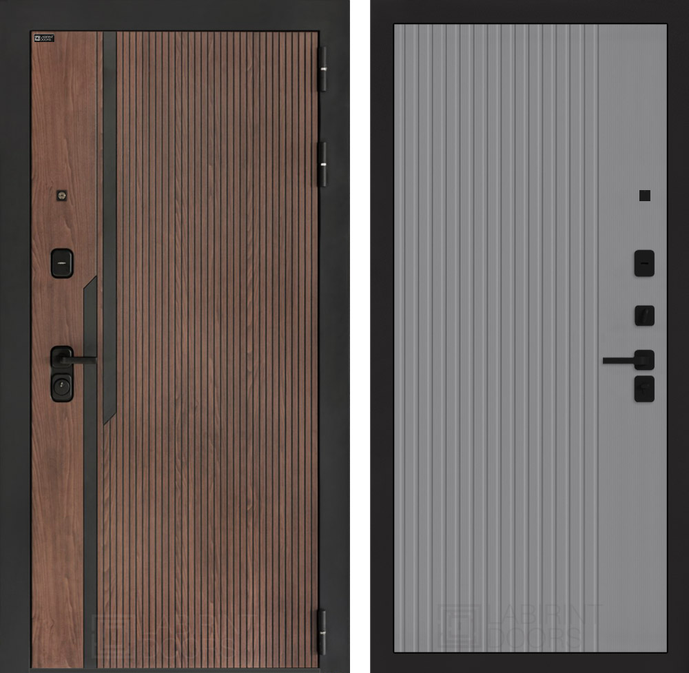 Отделка снаружи: Фрезерованная МДФ панель 10 мм, цвет «Орех американский» с патиной и вставками из металла в цвет наличника