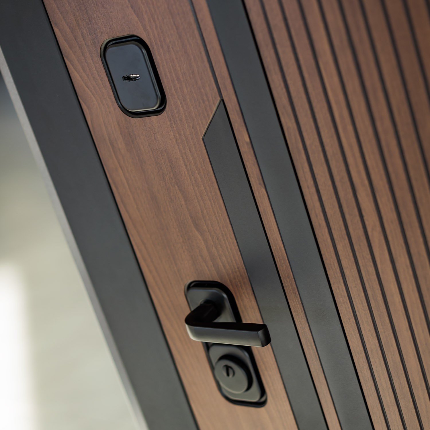 Полный комплект: Фурнитура в черном цвете: Броненакладка врезная, накладка со шторкой, глазок , дверная ручка, ночная задвижка. Цилиндр ключ-вертушка (производитель не регламентируется), регулируемый эксцентрик.