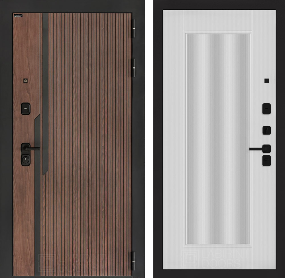 Отделка снаружи: Фрезерованная МДФ панель 10 мм, цвет «Орех американский» с патиной и вставками из металла в цвет наличника