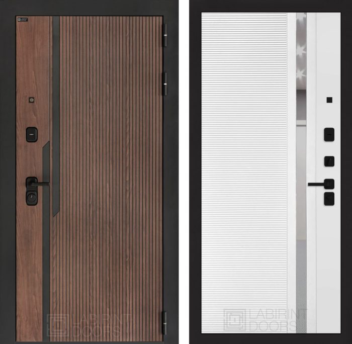 Отделка снаружи=’Фрезерованная МДФ панель 10 мм, цвет «Орех американский» с патиной и вставками из металла в цвет наличника’