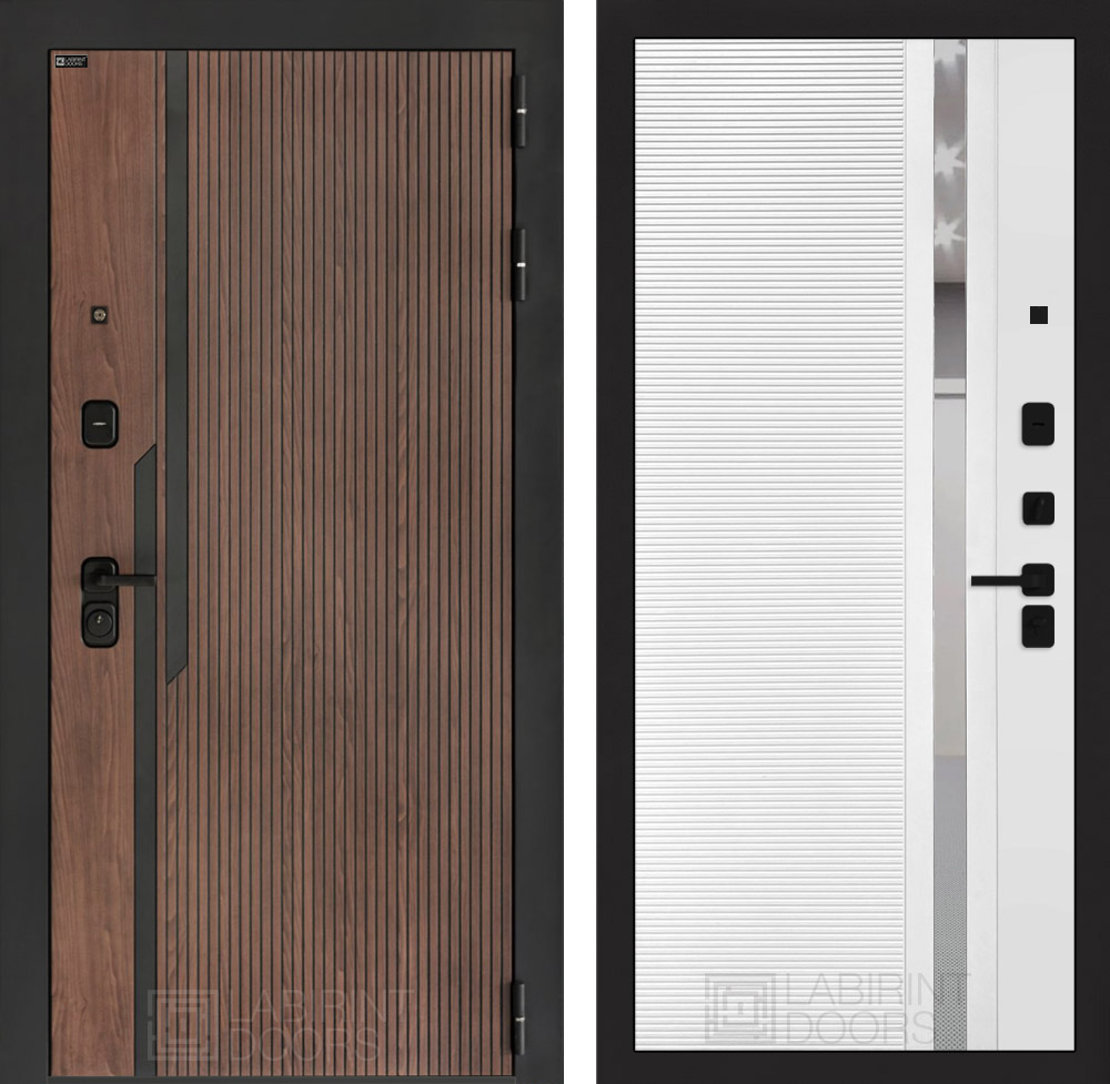 Отделка снаружи: Фрезерованная МДФ панель 10 мм, цвет «Орех американский» с патиной и вставками из металла в цвет наличника