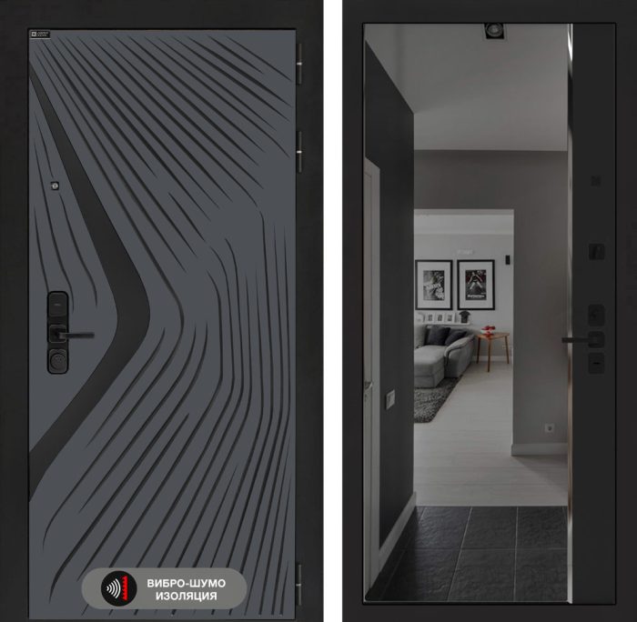 Отделка снаружи=’Фрезерованная МДФ панель 10 мм, цвет «Velluto Oscuro» с патиной и вставкой из металла в цвет наличника’