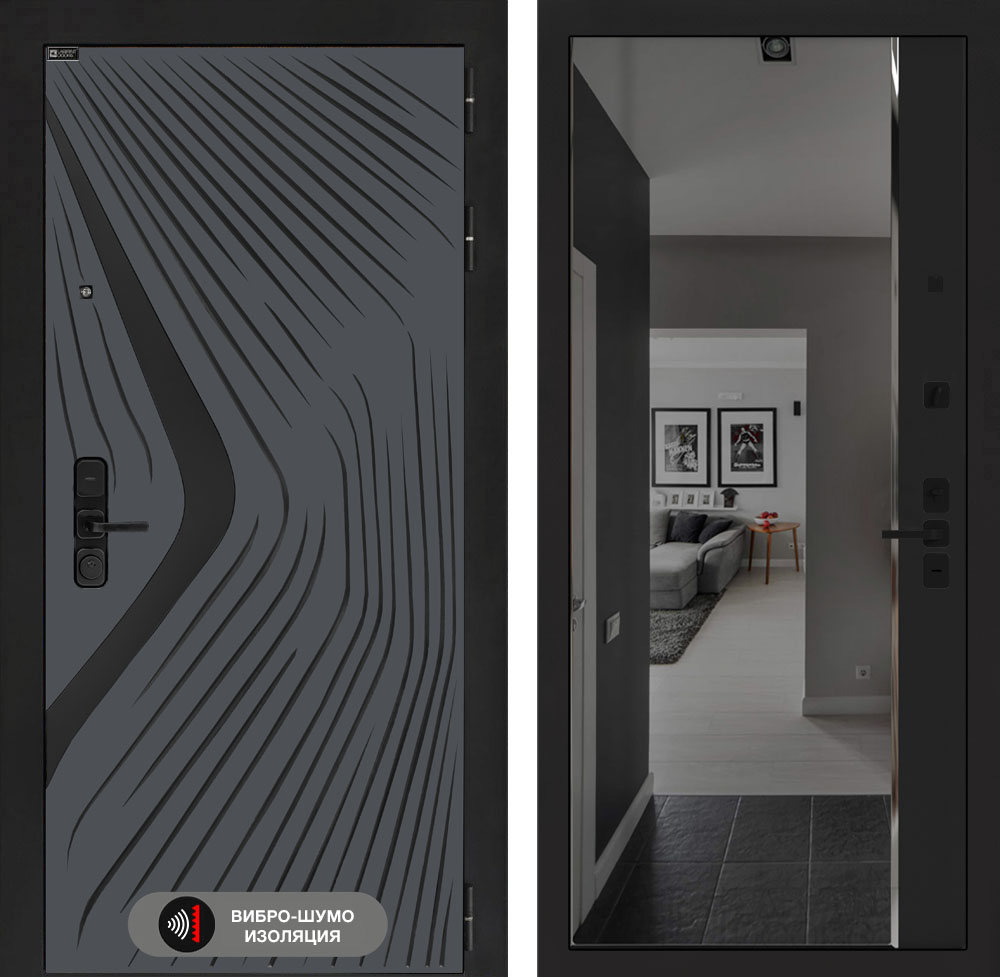 Отделка снаружи: Фрезерованная МДФ панель 10 мм, цвет «Velluto Oscuro» с патиной и вставкой из металла в цвет наличника