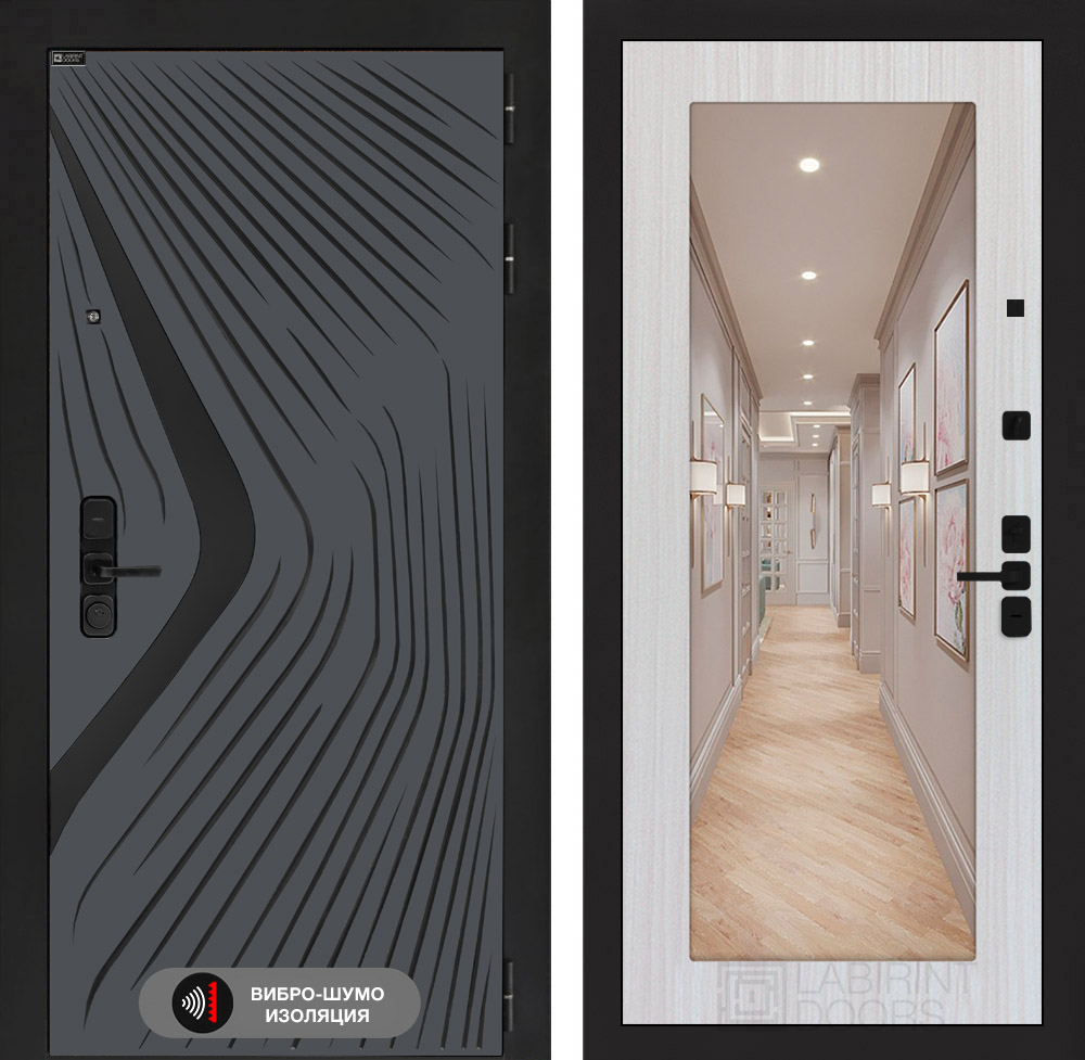 Отделка снаружи: Фрезерованная МДФ панель 10 мм, цвет «Velluto Oscuro» с патиной и вставкой из металла в цвет наличника
