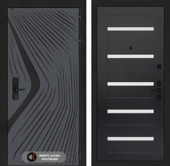Отделка снаружи=’Фрезерованная МДФ панель 10 мм, цвет «Velluto Oscuro» с патиной и вставкой из металла в цвет наличника’