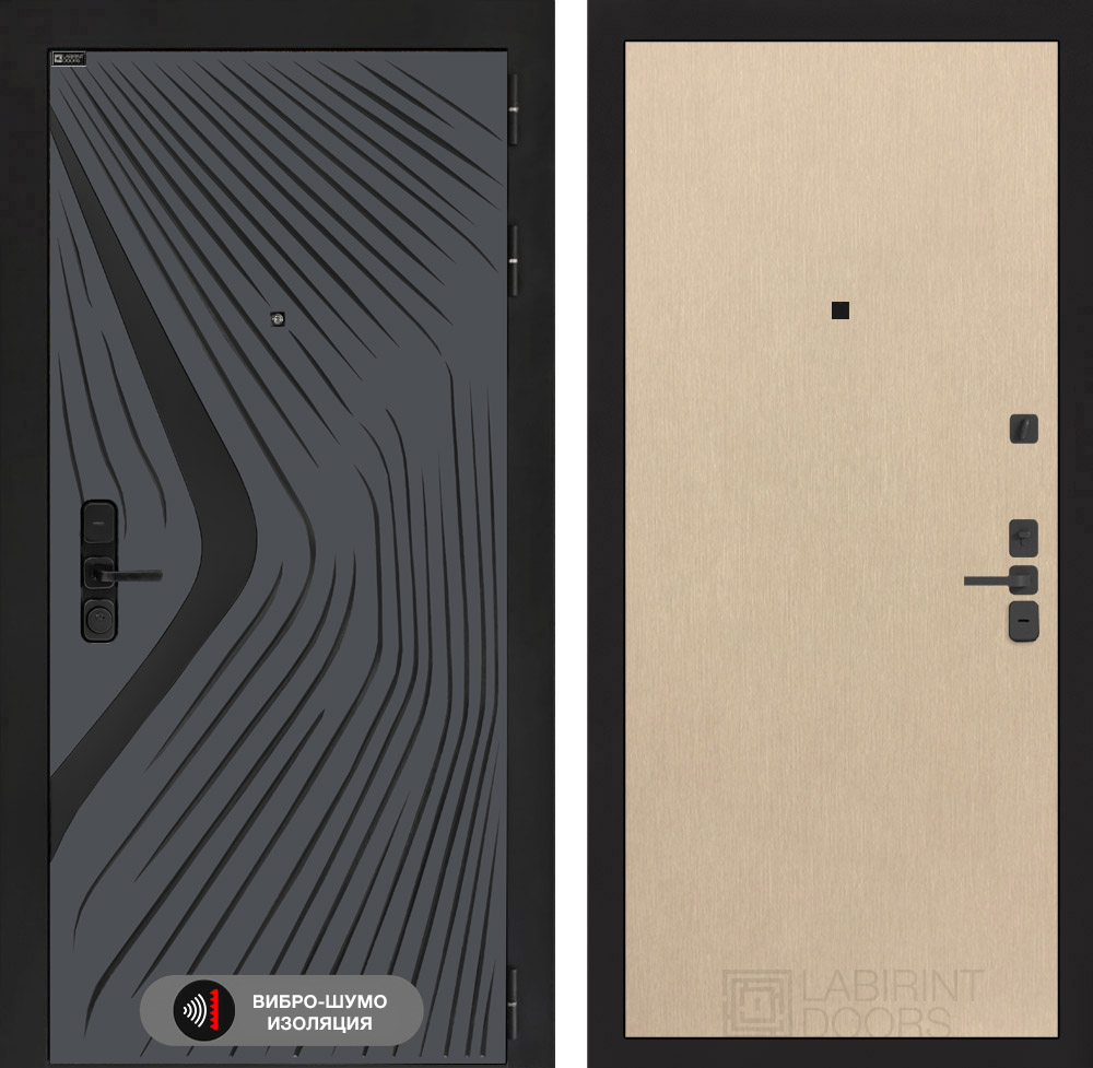 Отделка снаружи: Фрезерованная МДФ панель 10 мм, цвет «Velluto Oscuro» с патиной и вставкой из металла в цвет наличника