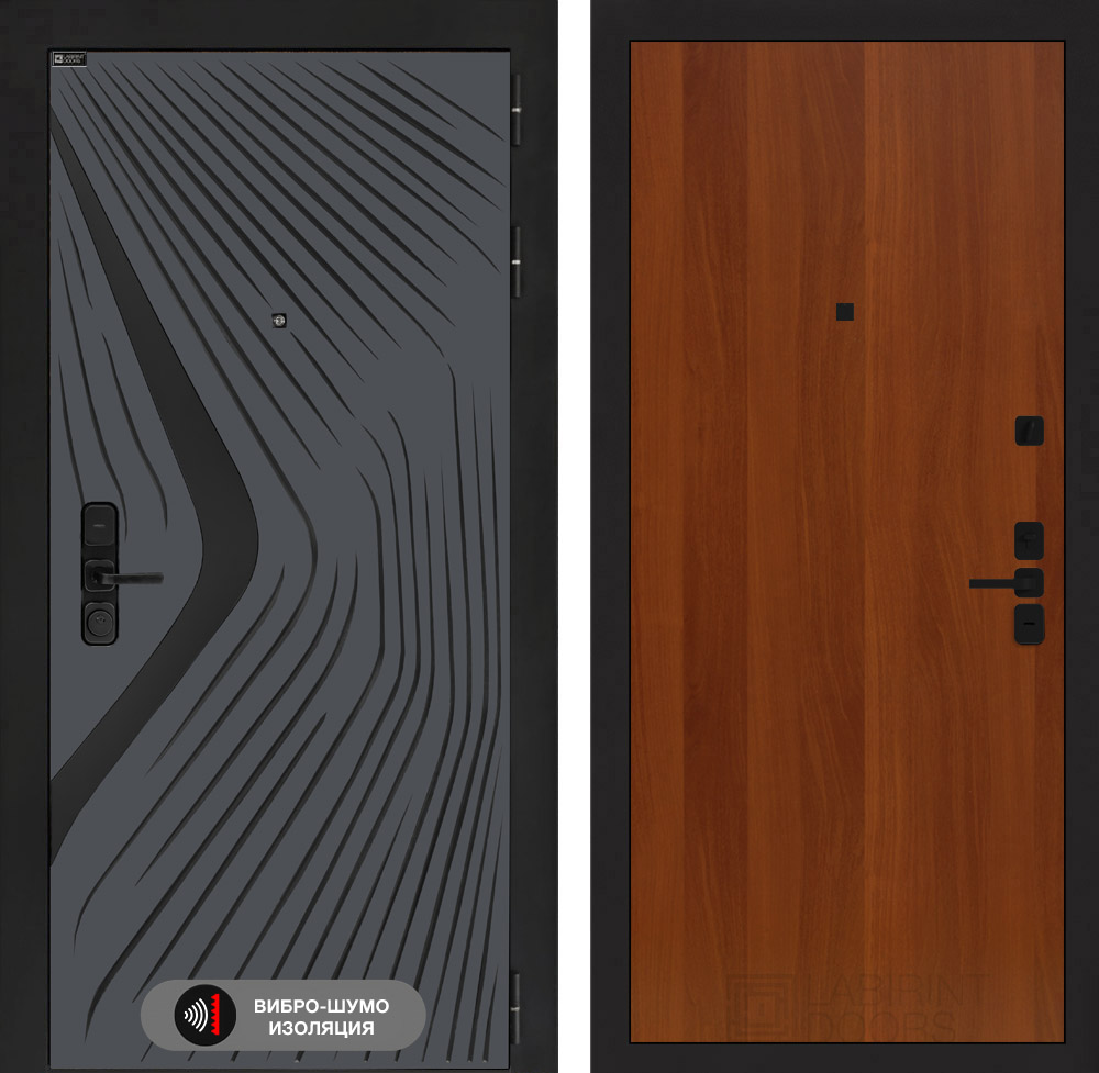 Отделка снаружи: Фрезерованная МДФ панель 10 мм, цвет «Velluto Oscuro» с патиной и вставкой из металла в цвет наличника