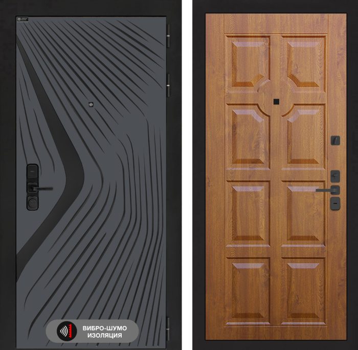 Отделка снаружи=’Фрезерованная МДФ панель 10 мм, цвет «Velluto Oscuro» с патиной и вставкой из металла в цвет наличника’