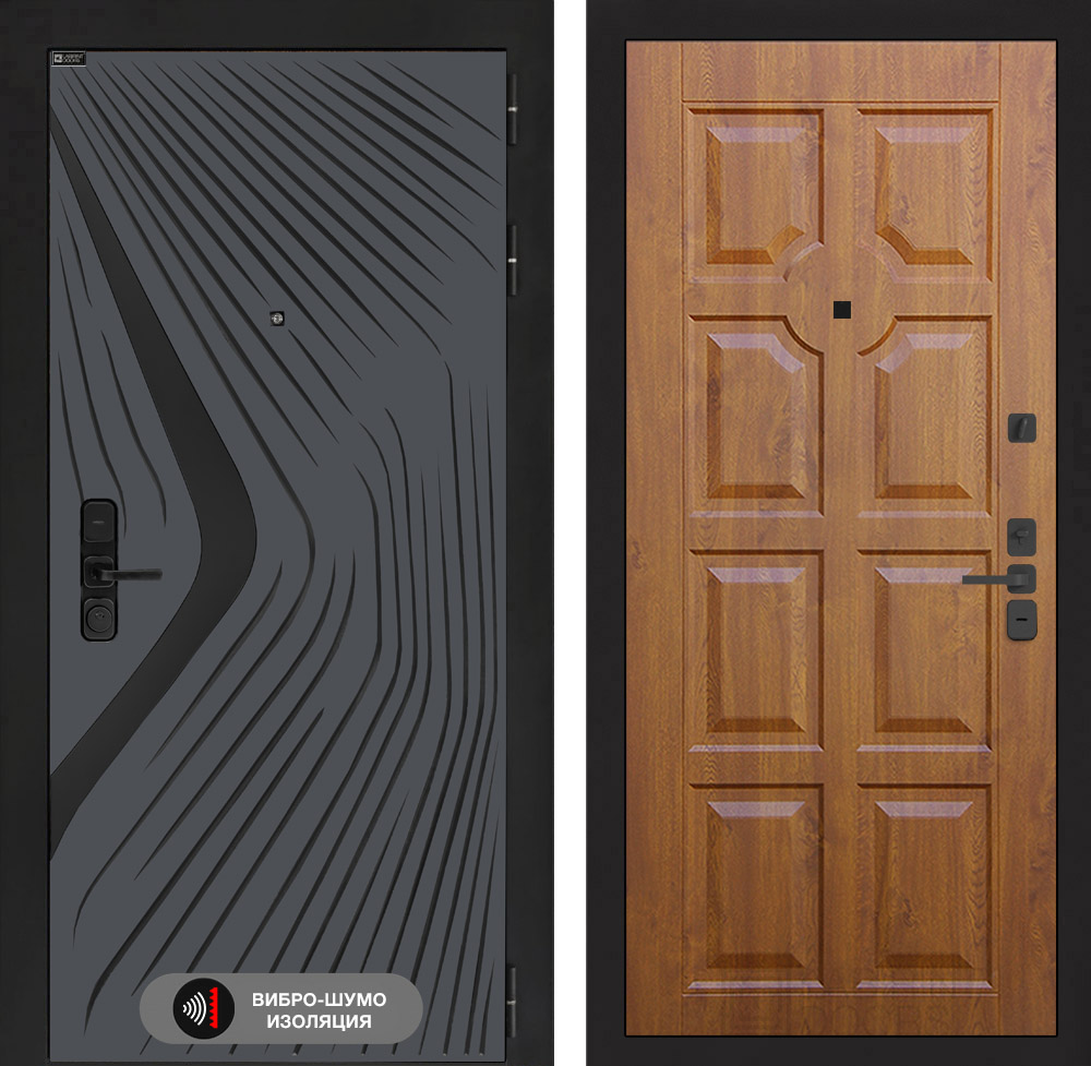 Отделка снаружи: Фрезерованная МДФ панель 10 мм, цвет «Velluto Oscuro» с патиной и вставкой из металла в цвет наличника