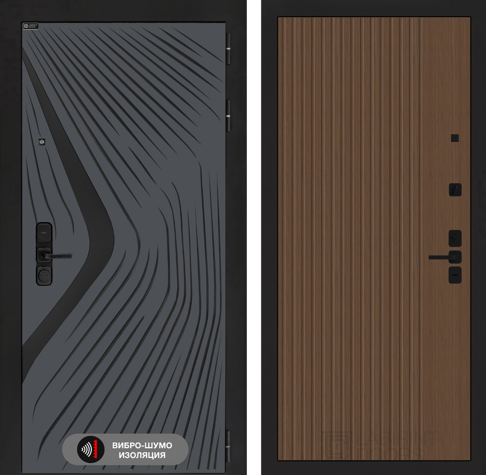 Отделка снаружи: Фрезерованная МДФ панель 10 мм, цвет «Velluto Oscuro» с патиной и вставкой из металла в цвет наличника