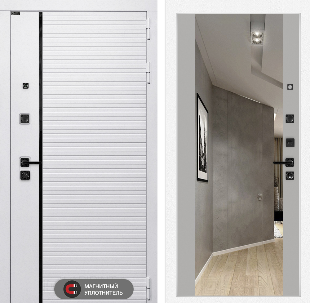 Отделка снаружи: Современная MDF панель 10 мм с наличником, цвет «Лофт белый», вставка черный молдинг