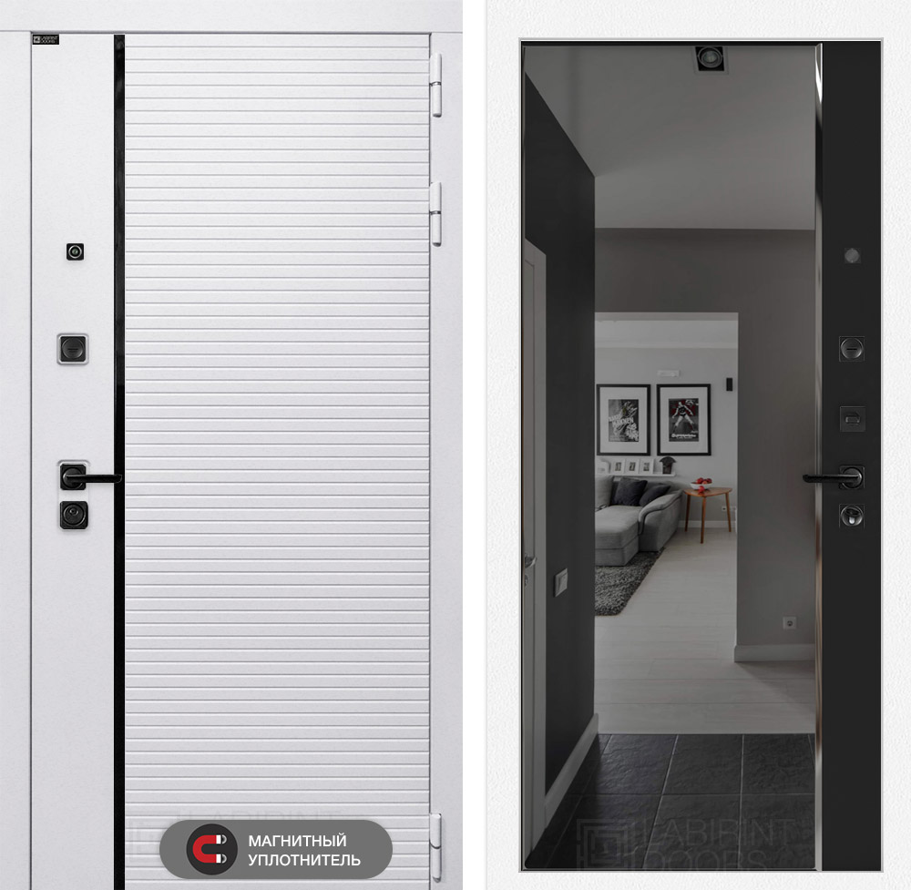 Отделка снаружи: Современная MDF панель 10 мм с наличником, цвет «Лофт белый», вставка черный молдинг