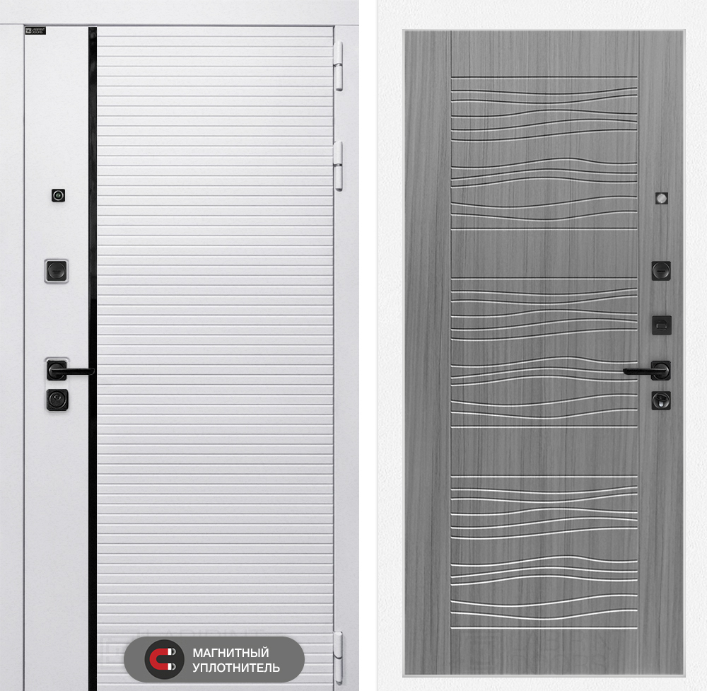 Отделка снаружи: Современная MDF панель 10 мм с наличником, цвет «Лофт белый», вставка черный молдинг