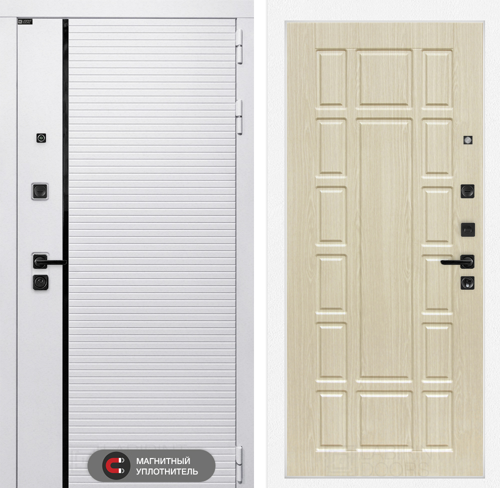 Отделка снаружи: Современная MDF панель 10 мм с наличником, цвет «Лофт белый», вставка черный молдинг