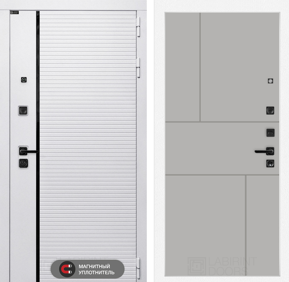 Отделка снаружи: Современная MDF панель 10 мм с наличником, цвет «Лофт белый», вставка черный молдинг