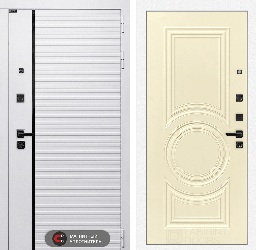 Отделка снаружи: Современная MDF панель 10 мм с наличником, цвет «Лофт белый», вставка черный молдинг