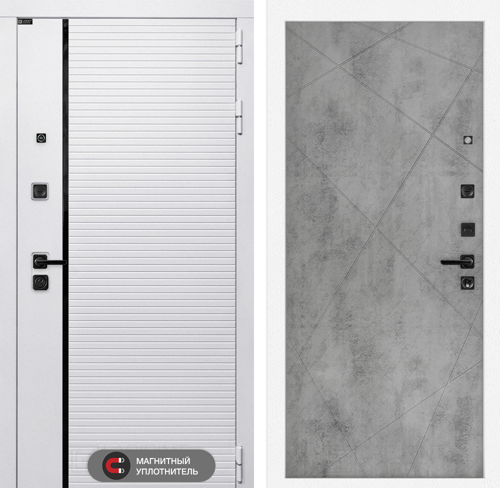 Отделка снаружи: Современная MDF панель 10 мм с наличником, цвет «Лофт белый», вставка черный молдинг