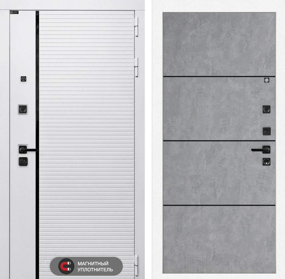 Отделка снаружи: Современная MDF панель 10 мм с наличником, цвет «Лофт белый», вставка черный молдинг