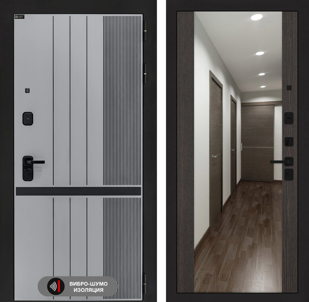 Отделка снаружи: Фрезерованная МДФ панель 10 мм, цвет «Velluto Grigio» с патиной и вставкой из металла в цвет наличника