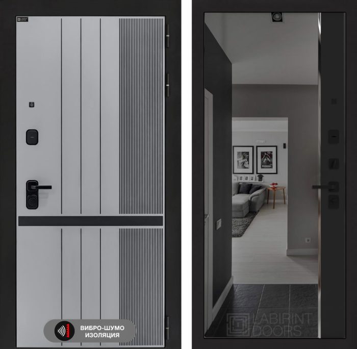 Отделка снаружи=’Фрезерованная МДФ панель 10 мм, цвет «Velluto Grigio» с патиной и вставкой из металла в цвет наличника’