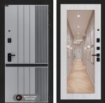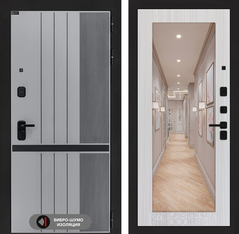 Отделка снаружи: Фрезерованная МДФ панель 10 мм, цвет «Velluto Grigio» с патиной и вставкой из металла в цвет наличника