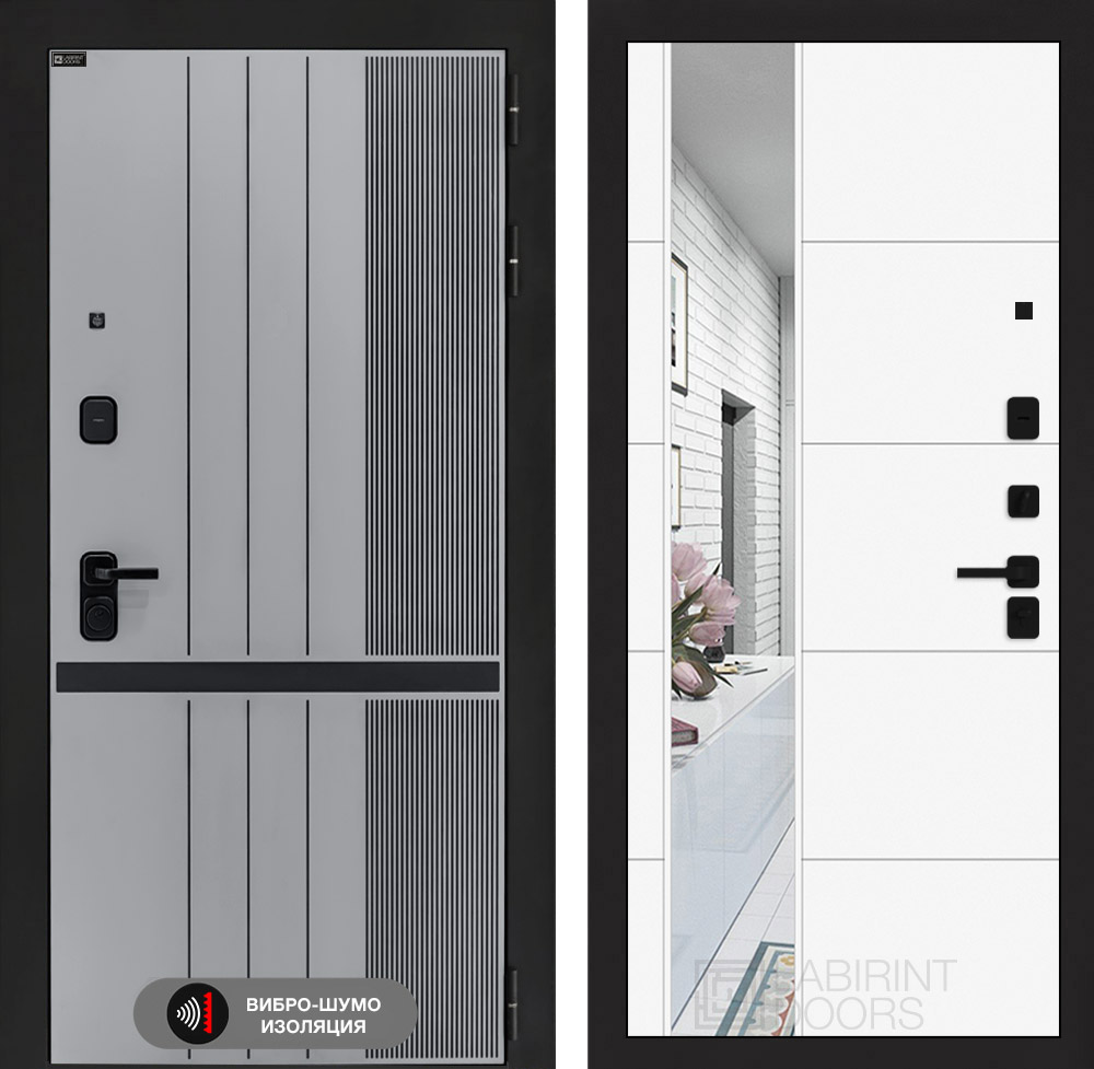 Отделка снаружи: Фрезерованная МДФ панель 10 мм, цвет «Velluto Grigio» с патиной и вставкой из металла в цвет наличника