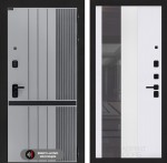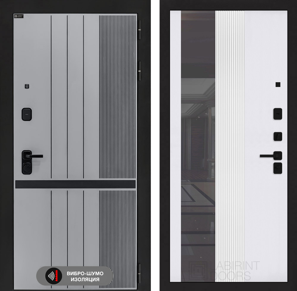 Отделка снаружи: Фрезерованная МДФ панель 10 мм, цвет «Velluto Grigio» с патиной и вставкой из металла в цвет наличника