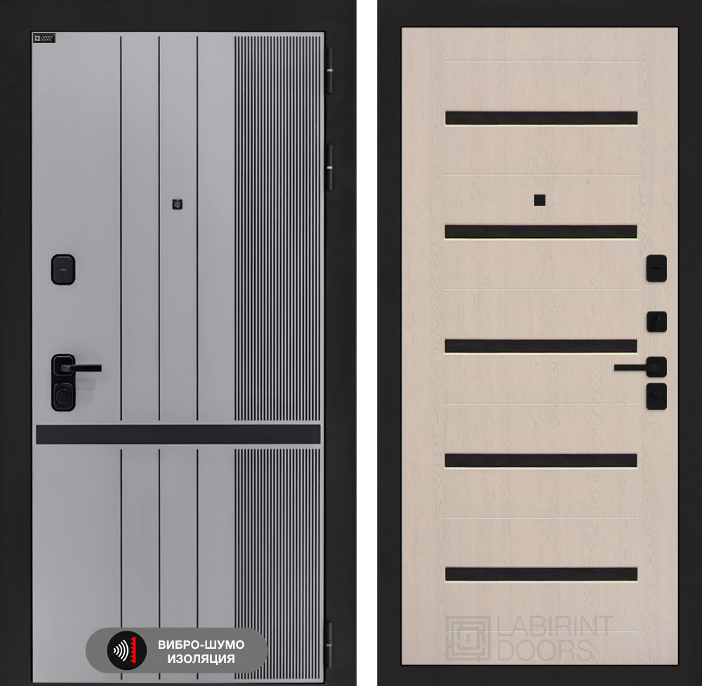 Отделка снаружи: Фрезерованная МДФ панель 10 мм, цвет «Velluto Grigio» с патиной и вставкой из металла в цвет наличника