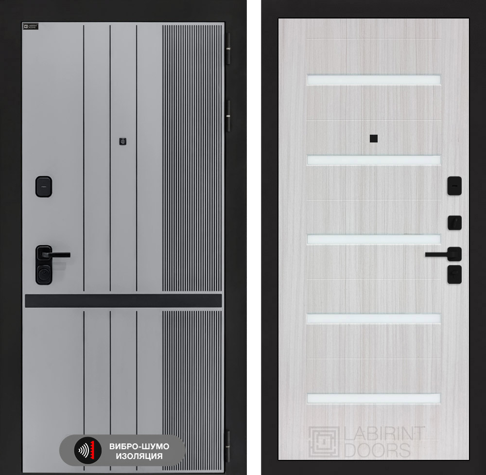 Отделка снаружи=’Фрезерованная МДФ панель 10 мм, цвет «Velluto Grigio» с патиной и вставкой из металла в цвет наличника’
