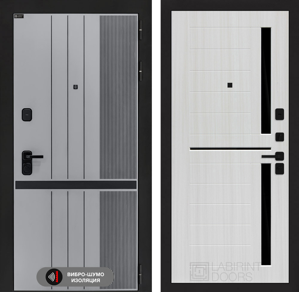 Отделка снаружи: Фрезерованная МДФ панель 10 мм, цвет «Velluto Grigio» с патиной и вставкой из металла в цвет наличника
