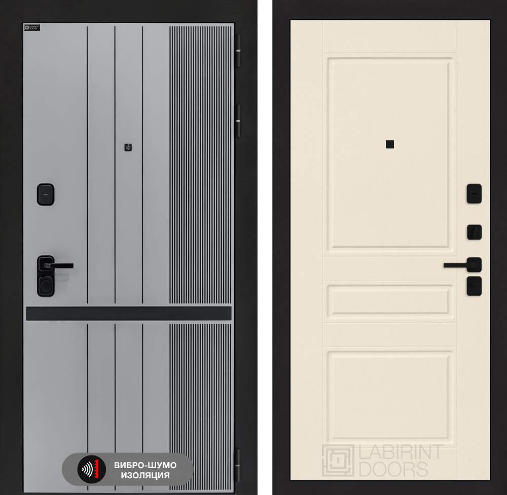 Отделка снаружи: Фрезерованная МДФ панель 10 мм, цвет «Velluto Grigio» с патиной и вставкой из металла в цвет наличника