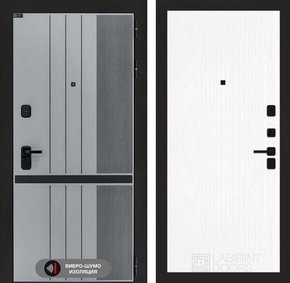 Отделка снаружи: Фрезерованная МДФ панель 10 мм, цвет «Velluto Grigio» с патиной и вставкой из металла в цвет наличника