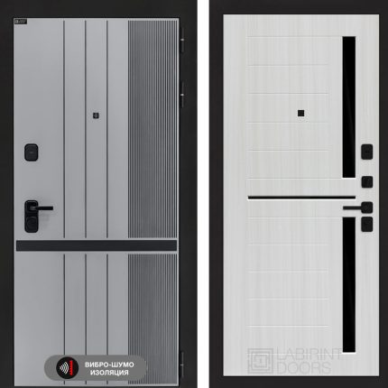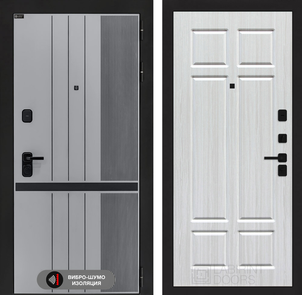 Отделка снаружи: Фрезерованная МДФ панель 10 мм, цвет «Velluto Grigio» с патиной и вставкой из металла в цвет наличника