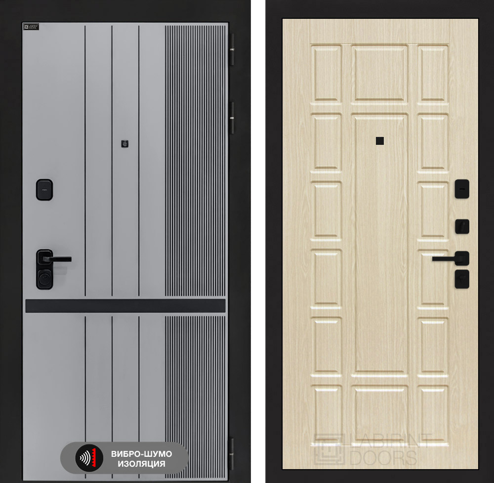 Отделка снаружи: Фрезерованная МДФ панель 10 мм, цвет «Velluto Grigio» с патиной и вставкой из металла в цвет наличника