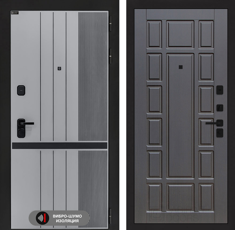 Отделка снаружи: Фрезерованная МДФ панель 10 мм, цвет «Velluto Grigio» с патиной и вставкой из металла в цвет наличника