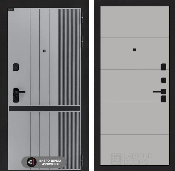 Отделка снаружи=’Фрезерованная МДФ панель 10 мм, цвет «Velluto Grigio» с патиной и вставкой из металла в цвет наличника’