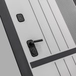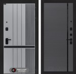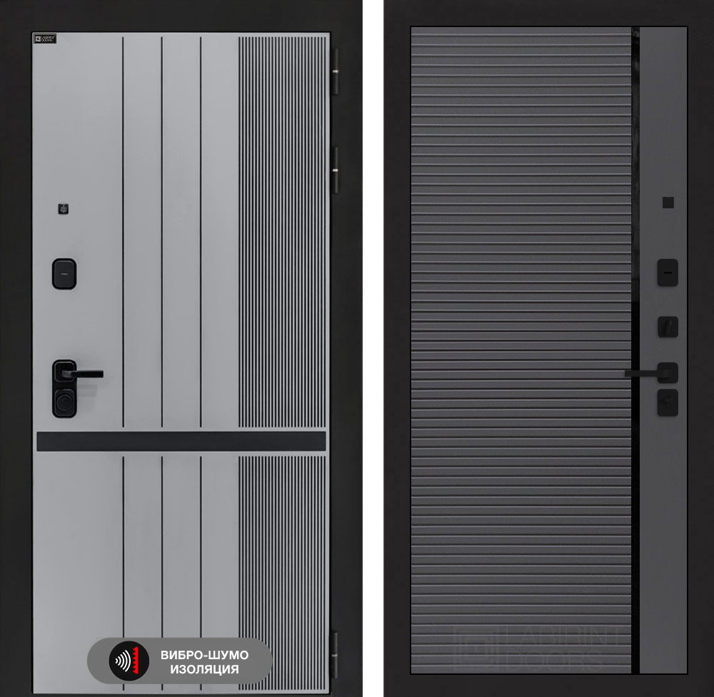 Отделка снаружи: Фрезерованная МДФ панель 10 мм, цвет «Velluto Grigio» с патиной и вставкой из металла в цвет наличника