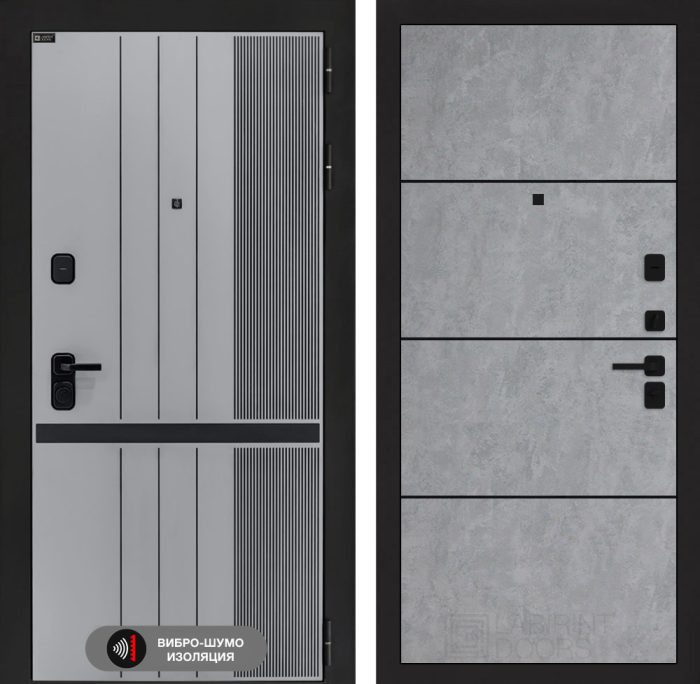 Отделка снаружи=’Фрезерованная МДФ панель 10 мм, цвет «Velluto Grigio» с патиной и вставкой из металла в цвет наличника’