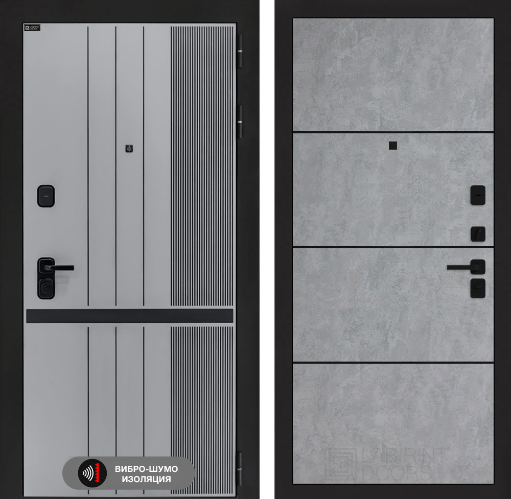 Отделка снаружи: Фрезерованная МДФ панель 10 мм, цвет «Velluto Grigio» с патиной и вставкой из металла в цвет наличника
