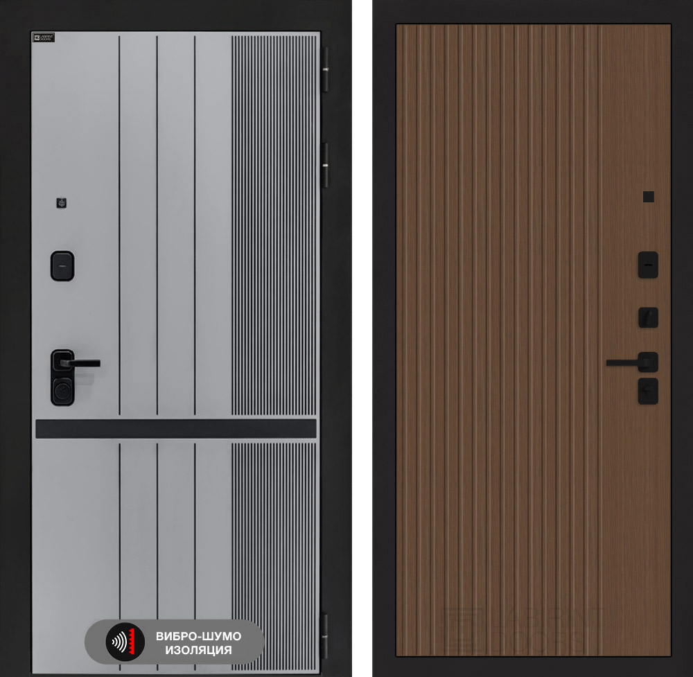 Отделка снаружи: Фрезерованная МДФ панель 10 мм, цвет «Velluto Grigio» с патиной и вставкой из металла в цвет наличника