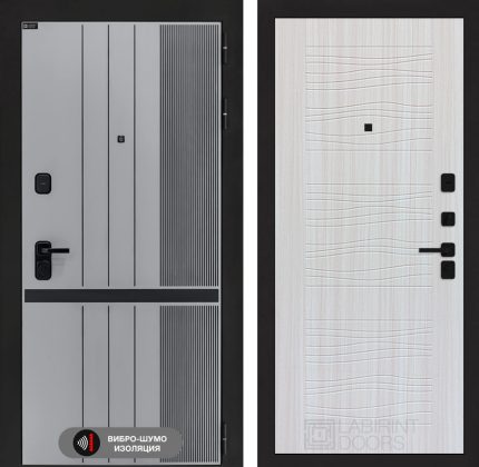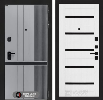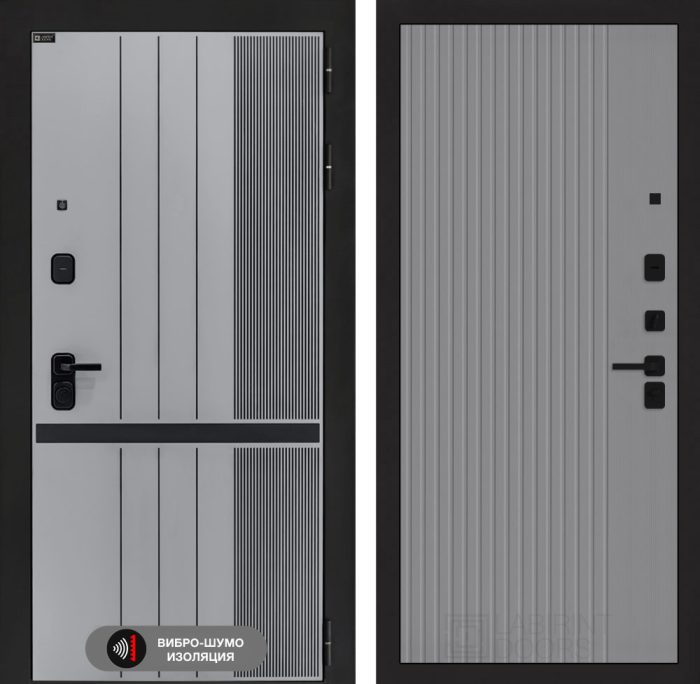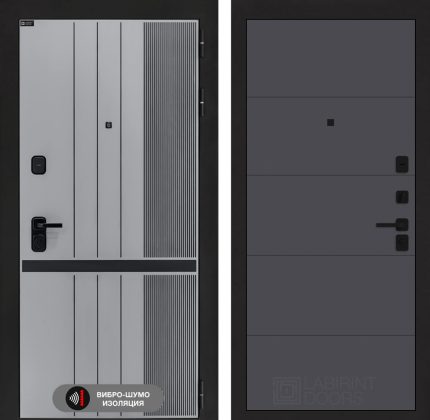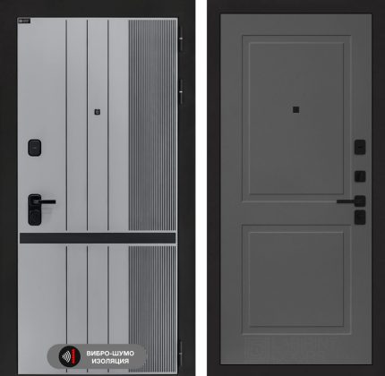 Отделка снаружи=’Фрезерованная МДФ панель 10 мм, цвет «Velluto Grigio» с патиной и вставкой из металла в цвет наличника’