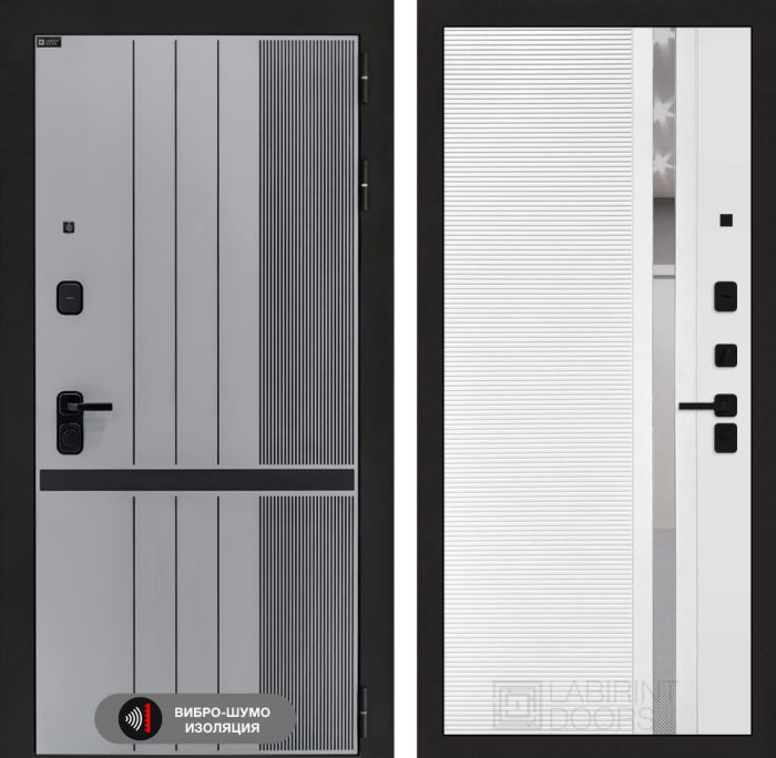 Отделка снаружи=’Фрезерованная МДФ панель 10 мм, цвет «Velluto Grigio» с патиной и вставкой из металла в цвет наличника’