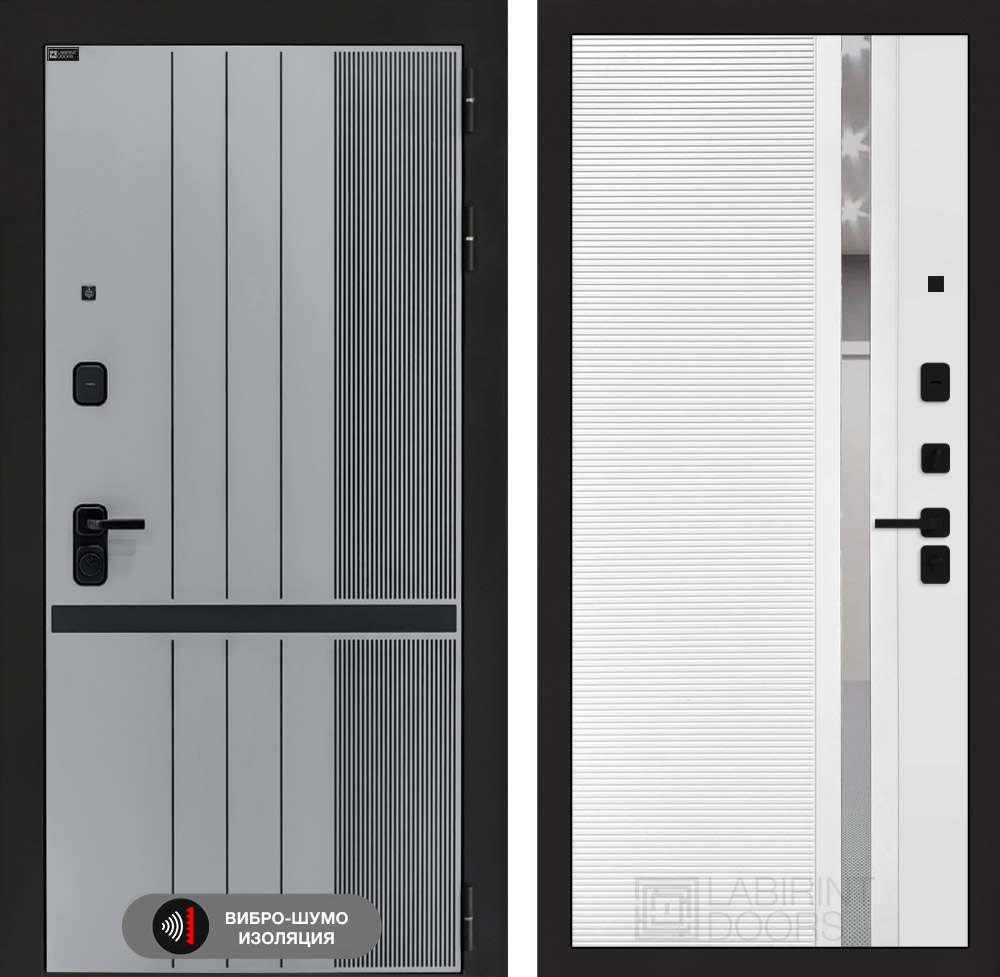 Отделка снаружи: Фрезерованная МДФ панель 10 мм, цвет «Velluto Grigio» с патиной и вставкой из металла в цвет наличника