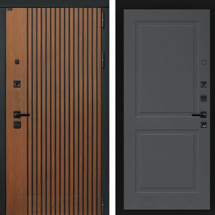 Отделка снаружи: Декоративная МДФ панель 10 мм в цвете «Дуб кантри темный» с черной патиной, наличники «Черный кварц»