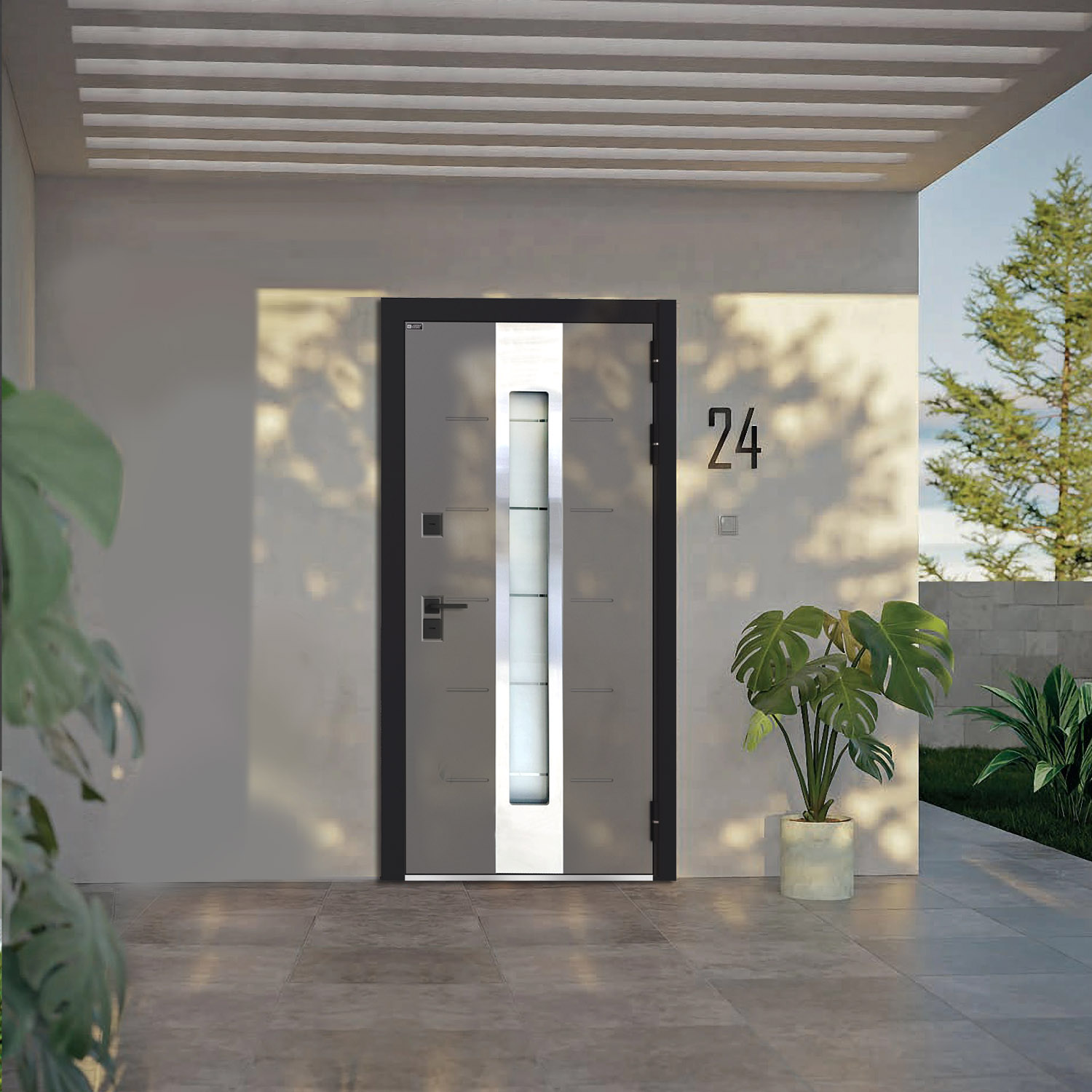 Отделка снаружи: Влагостойкая МДФ панель 10 мм с фрезеровкой, цвет «Grafit silk» (износостойкое покрытие) с отделкой из шлифованного хрома